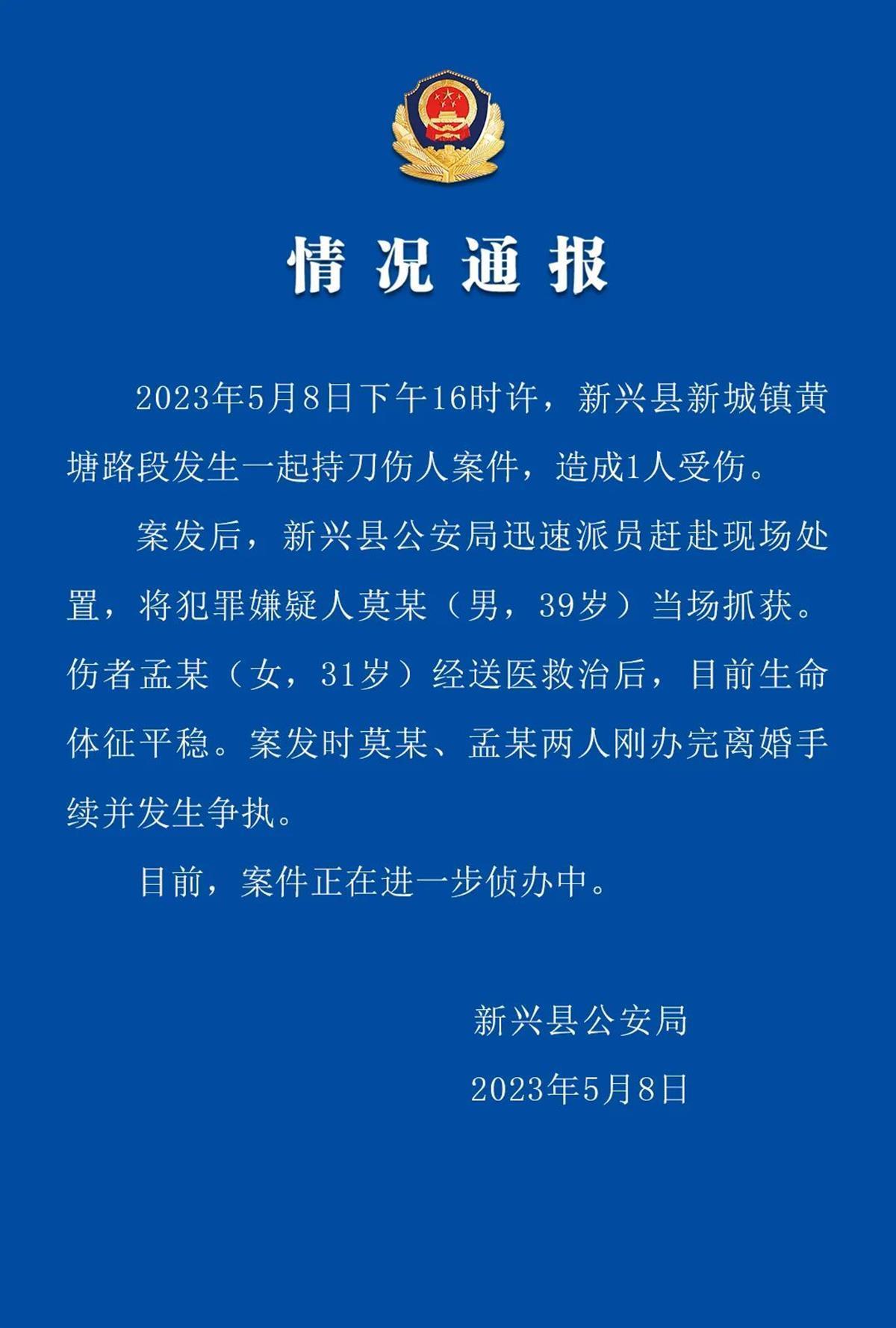 8日晚10时14分许,新兴县公安局发布情况通报称,2023年5月8日16时许,新兴县新城镇黄塘路段发生一起持刀伤人案件,造成1人受伤。案发后,新兴县公安局迅速派员赶赴现场处置,将犯罪嫌疑人莫某(男,39岁)当场抓获。伤者孟某(女,31岁)经送医救治后,目前生命体征平稳。案发时莫某、孟某两人刚办完离婚手续并发生争执。目前,案件正在进一步侦办中。