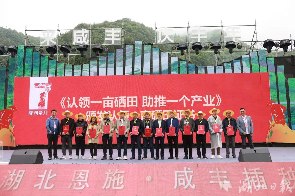 活动在极具活力的动感旋律中拉开帷幕。仪式感满满的“开秧门”,稻农在水田中插下第一棵秧苗,祈福风调雨顺、期盼五谷丰登;在唢呐与大鼓的交响声中,通过原生态土家摆手舞表演展现了绚丽厚重的农耕文化和“敬天爱人、自然和谐”的文化精神;伴随民谣《柒月硒米歌》响起,“认领一亩硒田、助推一个产业”仪式开启,来自全国各地的认领人分别认领了可全程溯源的一亩良田,并为他们颁发了认领证书,秋收时便可品尝到自家“责任田”里纯天然、绿色健康的富硒大米。