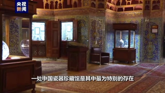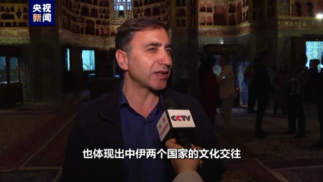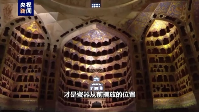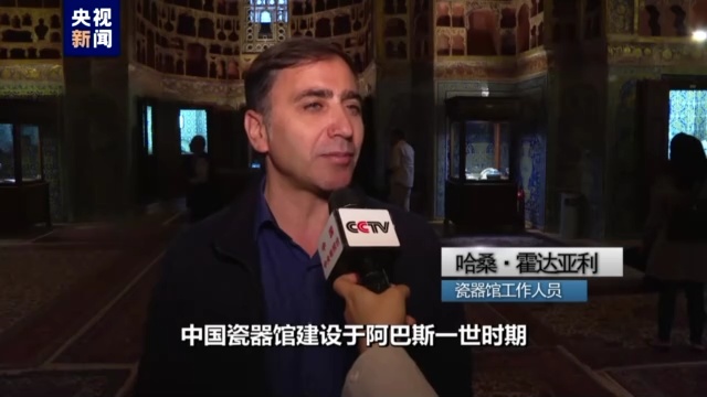 瓷器馆工作人员 哈桑·霍达亚利:这个地方为了摆放这些瓷器而建造,大约是人们头顶上方三米的地方。这显示了他们对中国的重视,也体现出中伊两个国家的文化交往。通过建设这个展厅,阿巴斯国王推进了两国的互相理解,促进了伊朗和中国文化艺术的交流。这样的艺术和文化互动一直延续至今。