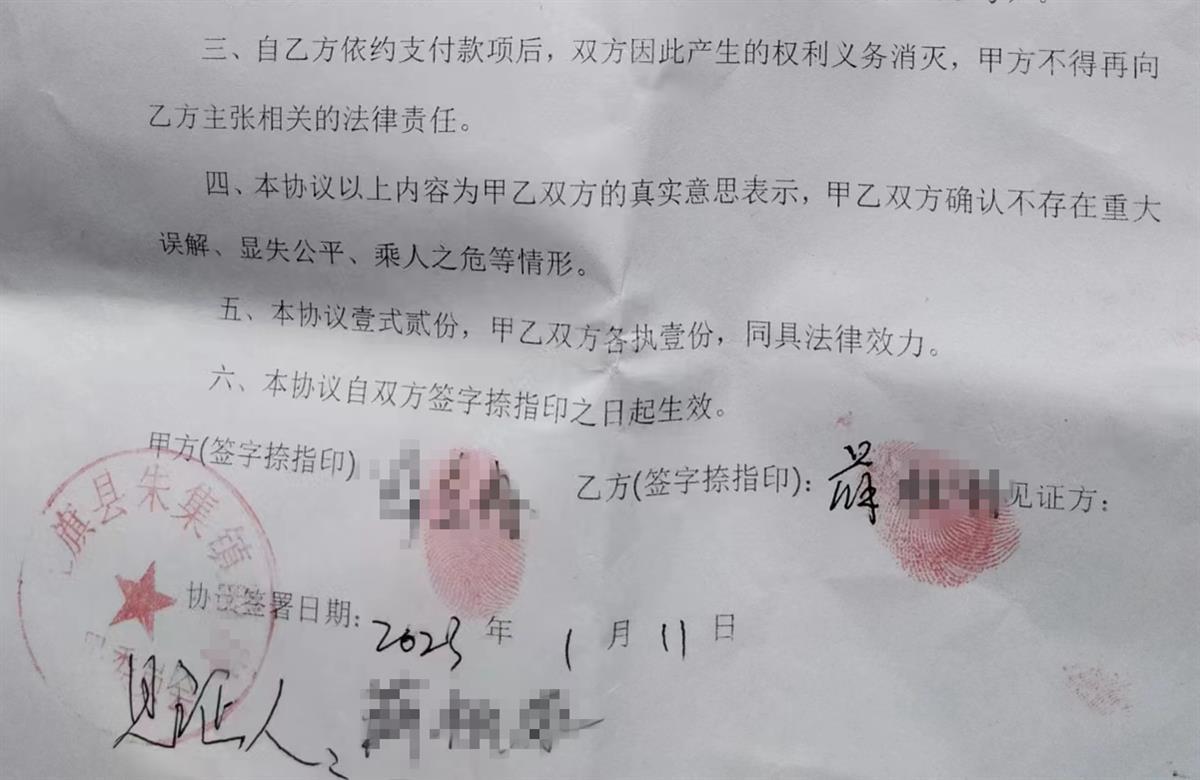 李女士说,今年1月,村里组织双方调解,她丈夫与邻居薛某签下和解协议,对方支付3万元。极目新闻记者从李女士出示的协议中看到,里面写明:“自乙方依约支付款项后,双方依此产生的权利义务消灭,甲方不得再向乙方主张相关的法律责任。”协议上有李女士丈夫、邻居薛某以及村干部的签名,还盖有村委会的公盖。