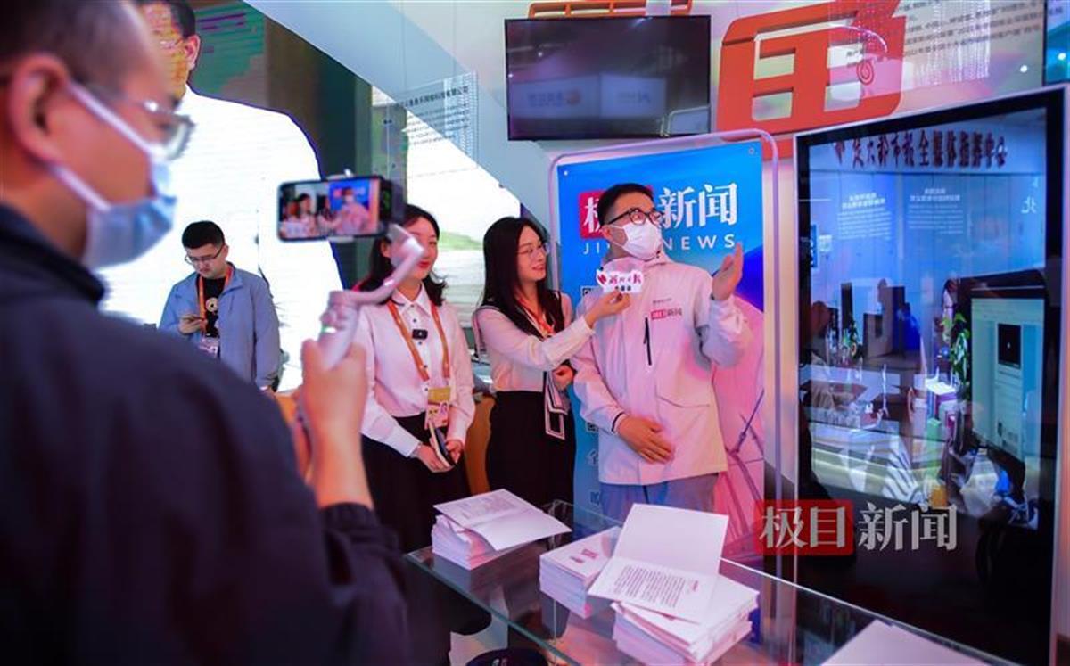 10日上午11时,极目新闻在展馆进行网络直播,带领网友“云”观展,有地方宣传部门同志和参展企业代表,在现场和线上看到直播后,邀请极目新闻记者参观其展馆展位,并表示加强宣传合作交流。