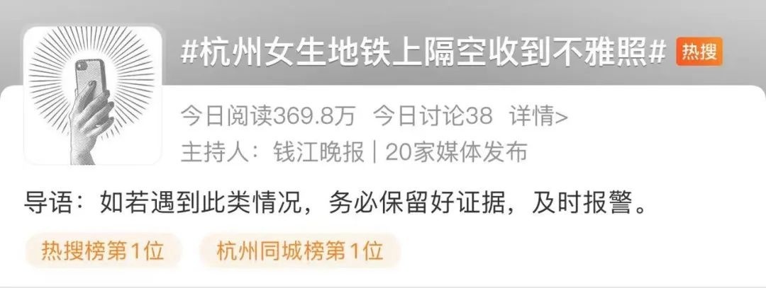 近日,#杭州女生地铁上隔空收到不雅照#登上微博热搜,引发众多网友讨论。