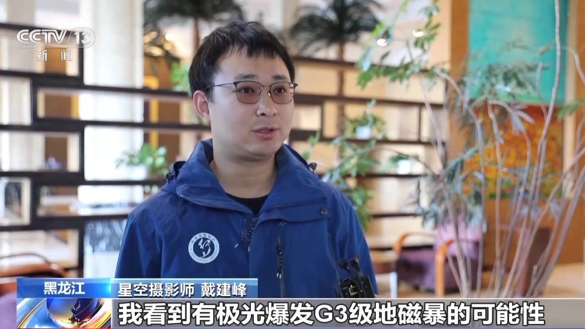 星空摄影师 戴建峰:前天(7日)晚上,我看到了有极光爆发G3级地磁暴的可能性,所以说马上就收拾行李,一路追星来到了漠河。(8日)一直等到了晚上的11时20分,突然在东北边,极光红色的光柱出现了,我就确定我们100%是拍到了极光,而且就在那大概十多分钟的时候,那一段极光活动非常剧烈。