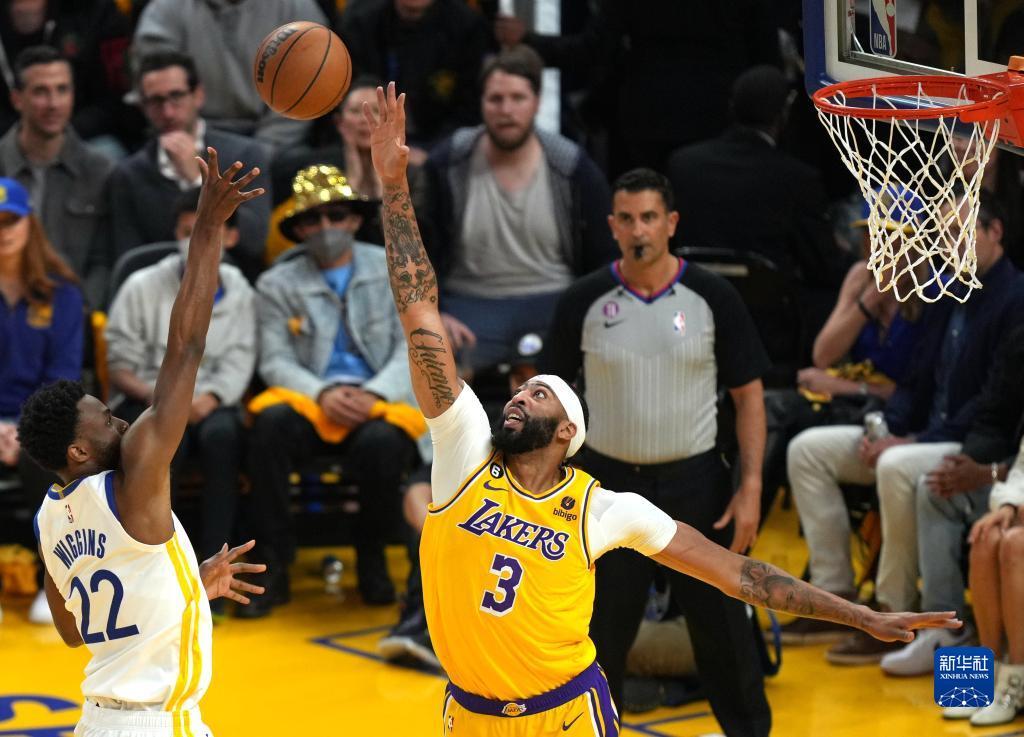 5月10日,湖人队球员安东尼·戴维斯(右)在比赛中防守勇士队球员维金斯投篮。新华社记者 吴晓凌 摄