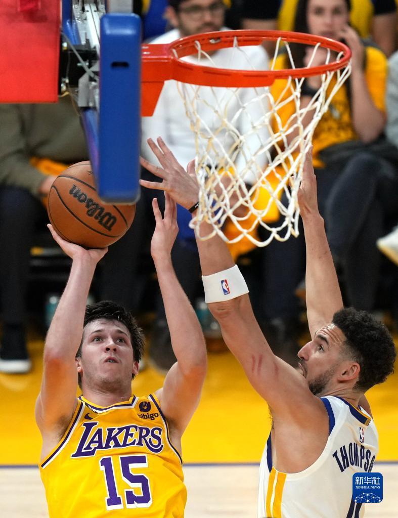 5月10日,勇士队球员汤普森(右)在比赛中防守湖人队球员奥斯汀·里维斯投篮。新华社记者 吴晓凌 摄