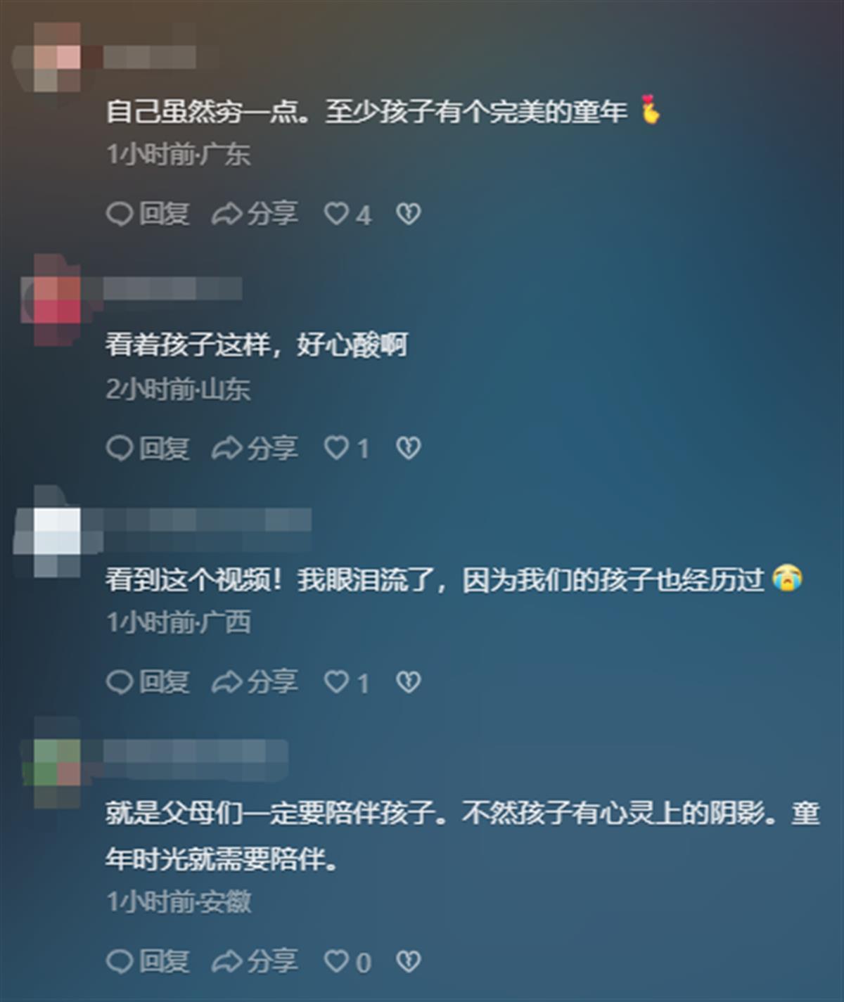 有网友表示,“看着孩子这样,好心酸啊。”还有网友认为,“父母们一定要陪伴孩子。童年时光需要陪伴。”