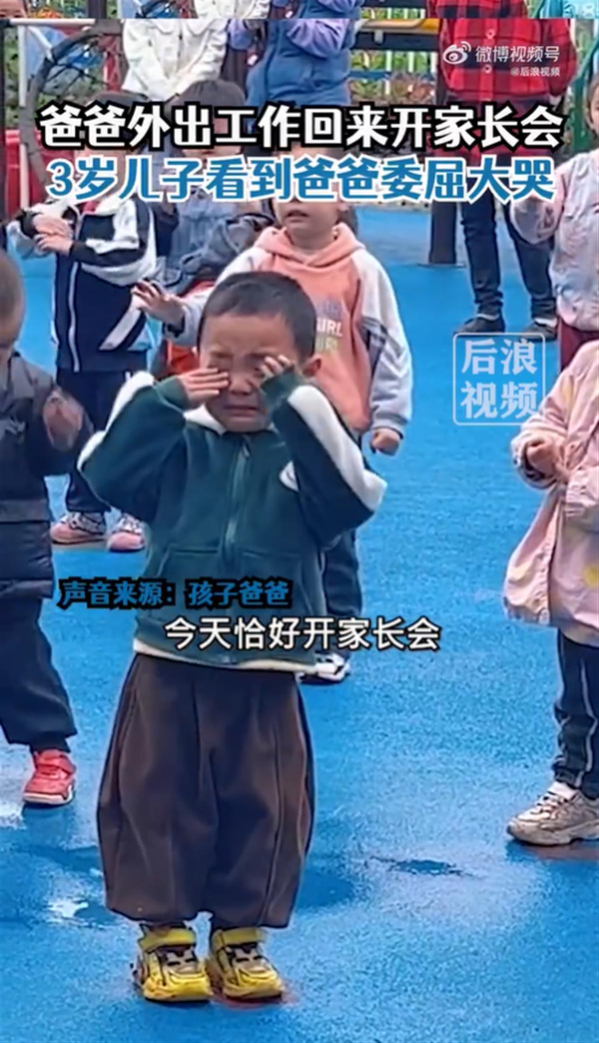 5月11日,四川泸州,3岁儿子在学校看到外出工作的爸爸回来开家长会,委屈大哭,这一幕让网友心酸。