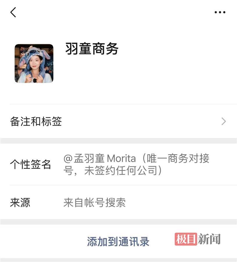 孟羽童商务工作人员的微信号介绍其本人还未签约任何公司