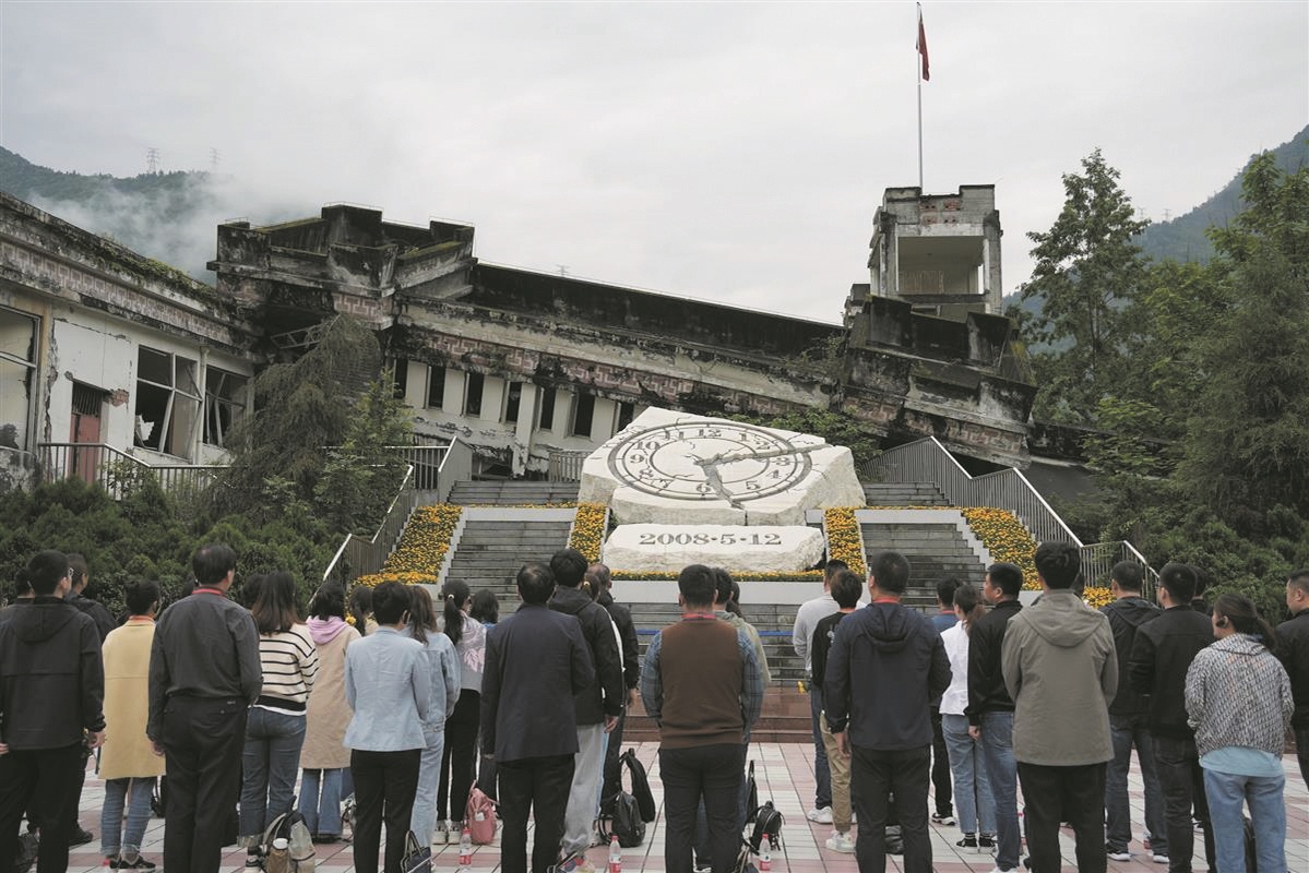 漩口中学遗址内的时钟雕塑,破碎的表盘上,时间永久定格在14时28分。2008年5月12日的这个时刻,四川汶川发生里氏8.0级特大地震,震中位于汶川县映秀镇。这是新中国成立以来破坏性最强、波及范围最广、灾害损失最重、救灾难度最大的一次地震。