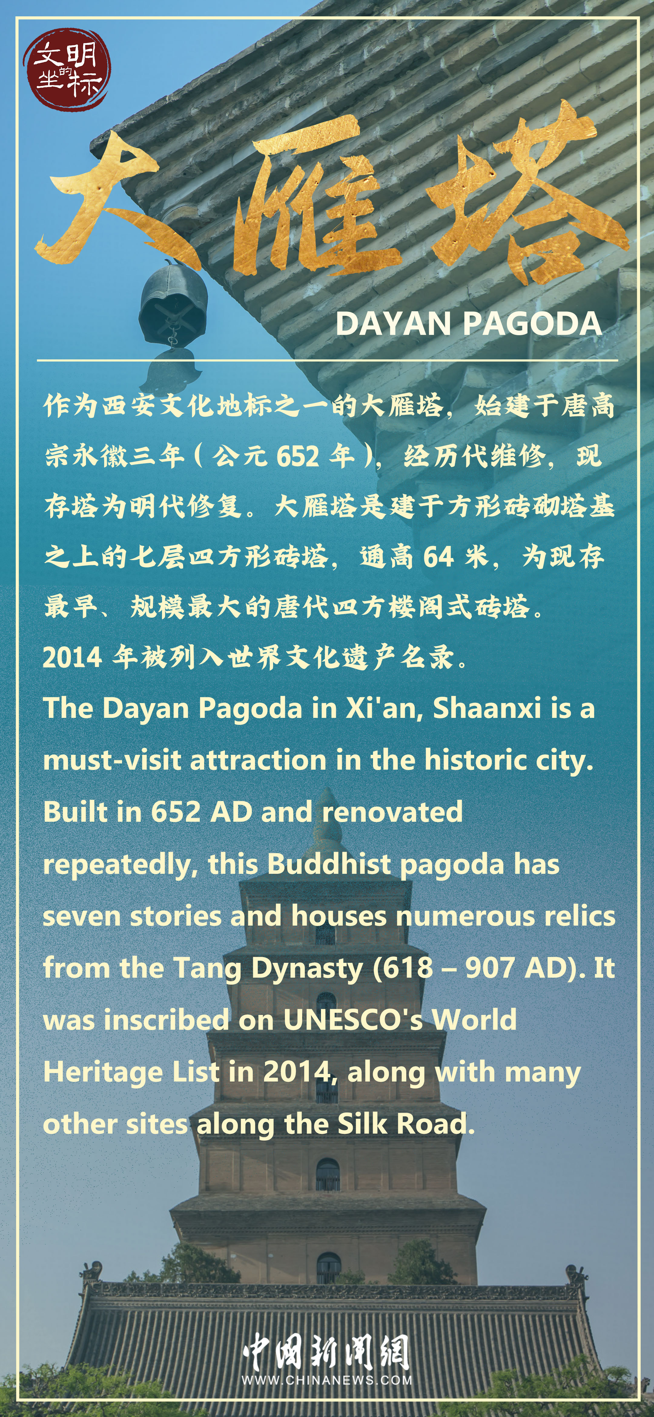 大雁塔又称大慈恩寺塔,位于陕西省西安市雁塔区,始建于唐高宗永徽三年(公元652年),为七层四方楼阁式砖塔。大雁塔现塔身通高64米,是为保存玄奘法师经丝绸之路带回长安的经卷佛像而建,塔下碑文记述和佐证了大雁塔与丝绸之路佛教传播的历史。整个建筑气魄宏大,庄严古朴,是唐代建筑艺术的杰作。走近大雁塔,感受“塔势如涌出,孤高耸天宫”的气势,触摸“曲江流饮,雁塔题名”的历史文脉。