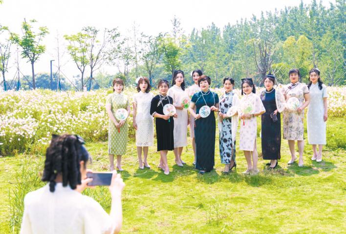5月12日,武汉胜利公园,身穿旗袍的女建设者们在花海中拍照。当天,中建三局总承包公司湖北公司组织女性建设者开展“工地母亲 蝶变芳华”母亲节庆祝活动。这些平日里坚守在重大工程施工现场的女建设者们,换下工装身穿旗袍,绘团扇、赏花景、拍写真,在光影闪烁间记录正盛芳华。