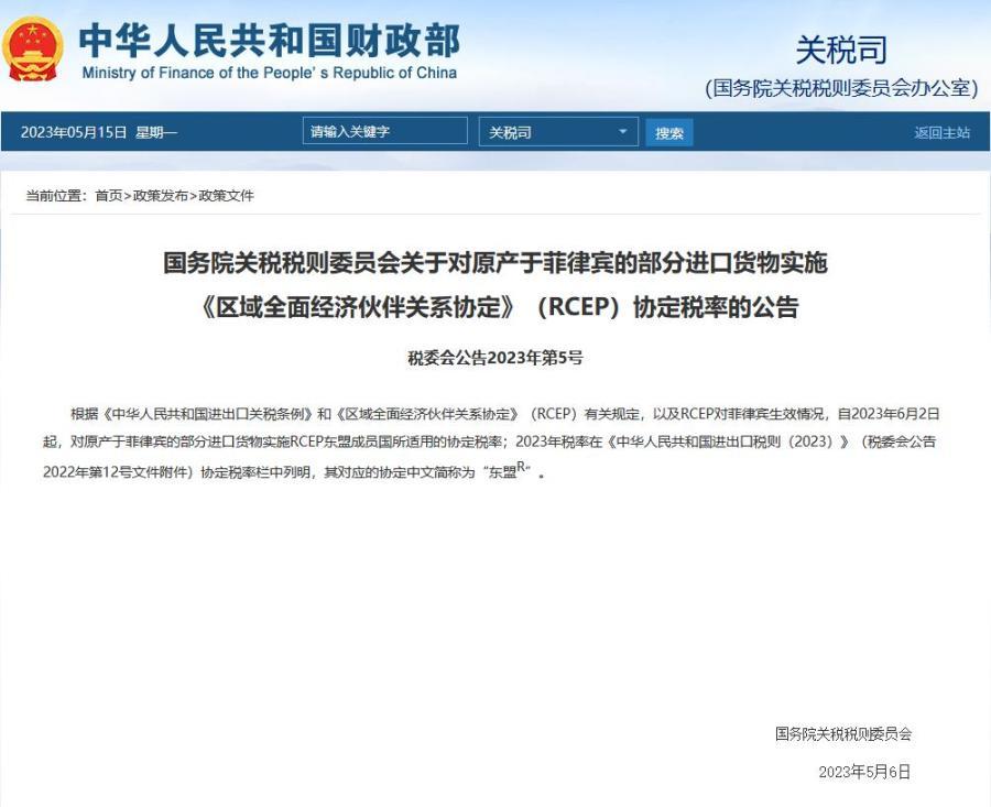 中新网5月15日电 据财政部网站15日消息,根据《中华人民共和国进出口关税条例》和《区域全面经济伙伴关系协定》(RCEP)有关规定,以及RCEP对菲律宾生效情况,自2023年6月2日起,对原产于菲律宾的部分进口货物实施RCEP东盟成员国所适用的协定税率;2023年税率在《中华人民共和国进出口税则(2023)》(税委会公告2022年第12号文件附件)协定税率栏中列明,其对应的协定中文简称为“东盟R”。