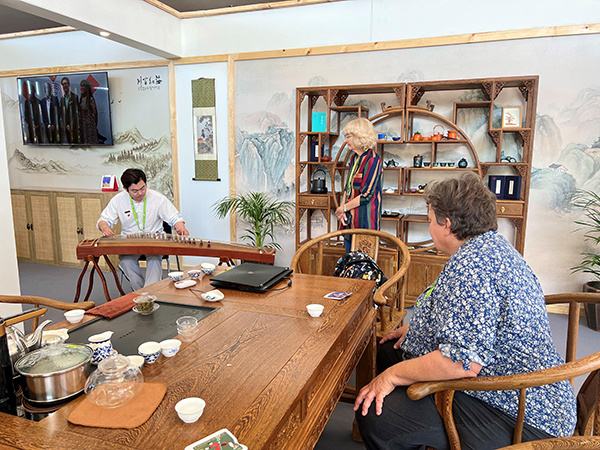 作为南非首个中国茶文化体验中心,中国传统茶艺在这一极具特色的非洲旅游文化盛宴上精彩亮相,形成别具一格的文化碰撞。在这古香古色的茶室里,茶香弥漫,琴声悠扬。美轮美奂的茶具、行云流水的茶艺和典雅的古筝演奏共同构成了一幅传统文化之画卷。参观者们在近距离体验茶艺的同时,还亲身感受到了中国茶文化的独特魅力与韵味。