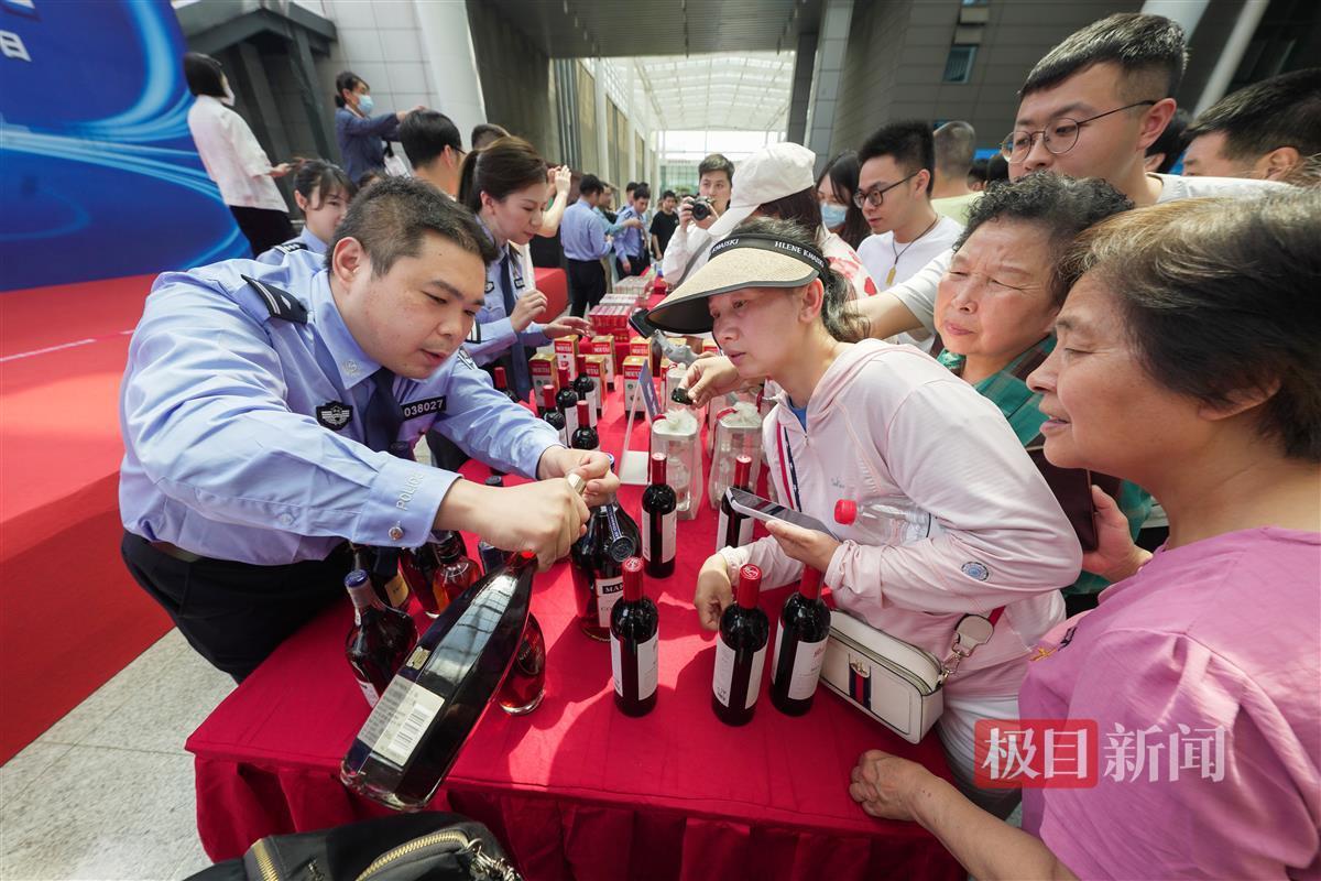 “看红酒的真假,可以从瓶盖、标签、瓶底等几个方面仔细辨别……”当天上午,在武汉园博园的活动现场,假酒、假药、假烟以及各类假冒伪劣商品的展台一字排开,吸引了大量群众驻足围观,民警和工作人员结合侦办的案例,现场向群众普及各类识假辨假知识,提醒群众增强防范意识,守好自己的“钱袋子”。