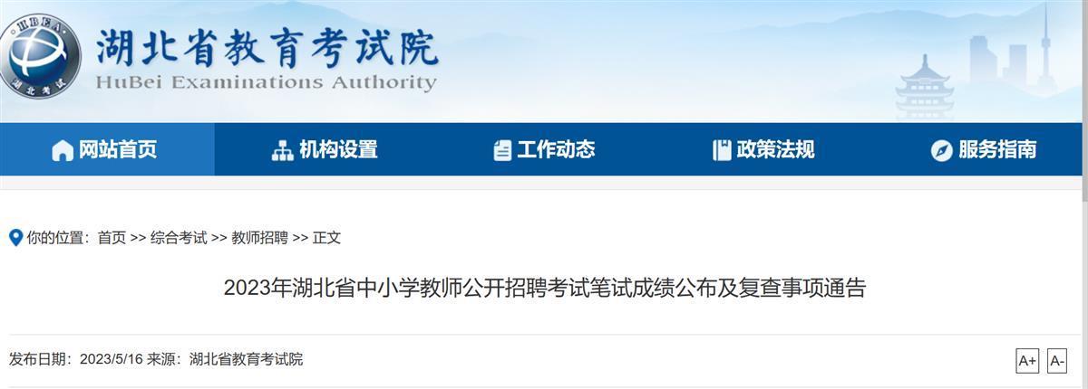 对考试成绩存在异议的考生可于5月19日16:30前(上午9:00-11:30,下午14:00-16:30)持身份证、准考证,到参加考试地的市州教育考试机构申请成绩复查,逾期不再办理。复查结果将于5月23日在2023年湖北省中小学教师公开招聘考试报名平台(http://nc.hbea.edu.cn/)反馈给考生。