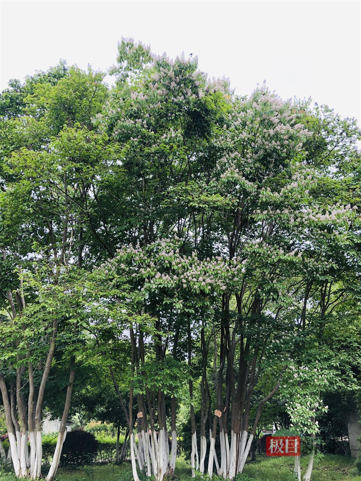 记者看到,5株马灵光位于白玉公园寻芳苑外,一株株高大挺拔,树干笔直光滑。翠色欲滴的枝叶间一串串白色的花朵点缀其间,格外清新养眼。一阵风过,树上便飘下一场花瓣雨。仔细看那白花,每一朵有六个瓣,一瓣瓣都像小扇子,聚拢在一起就像一条特别的“褶皱裙”,格外可爱清新。