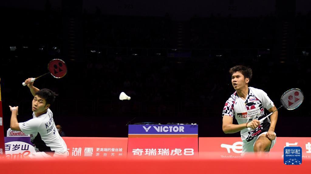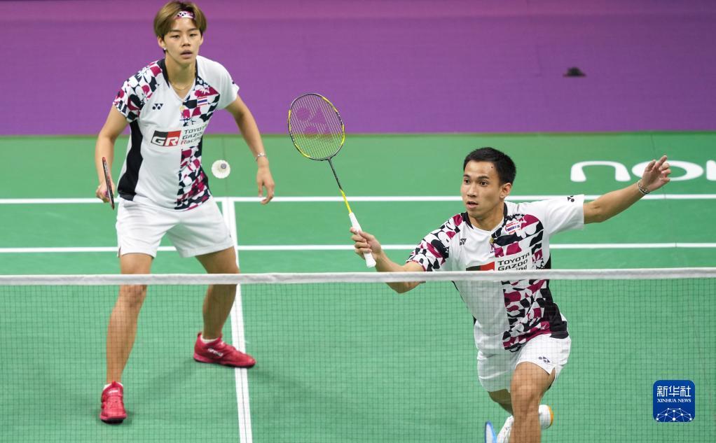 5月18日,泰国组合苏柏克(右)/吉丁努蓬在男双比赛中,他们以0比2不敌印度尼西亚组合阿尔菲安/阿迪安托。新华社记者 侯昭康 摄
