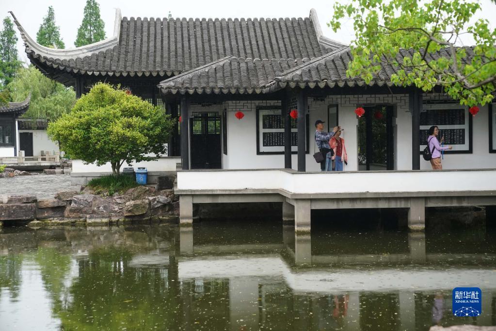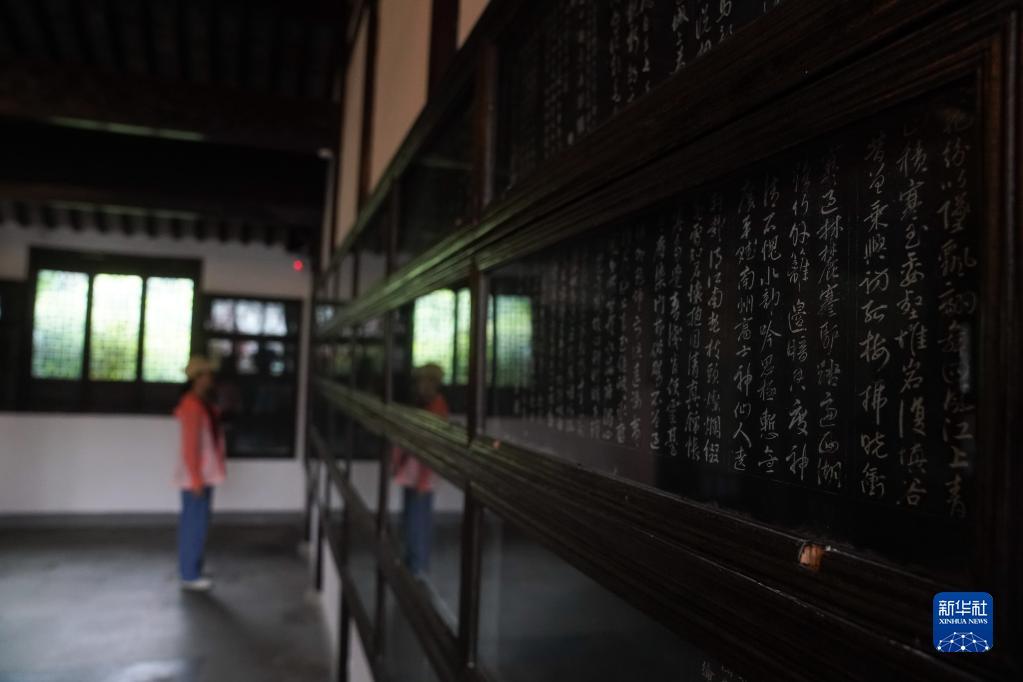 游人在仰圣园内的徐霞客游记碑廊游览(5月17日摄)。