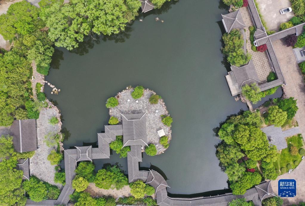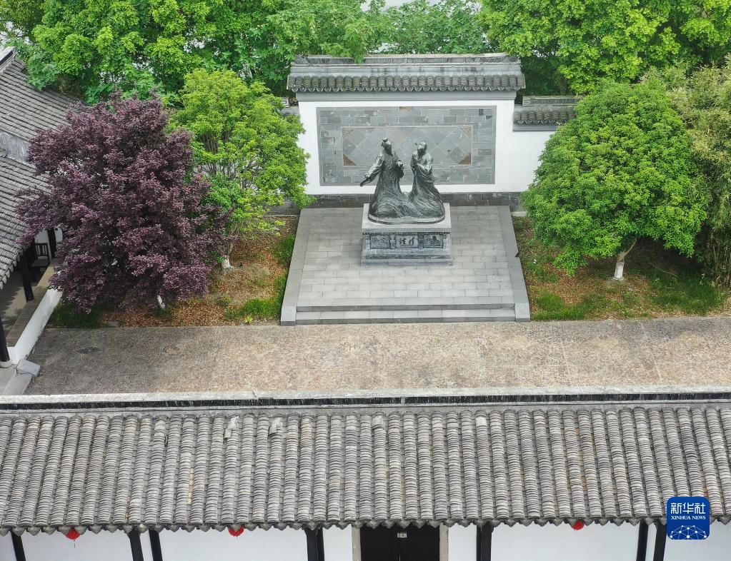 在仰圣园内拍摄的徐霞客与友人木增塑像(5月16日摄,无人机照片)。