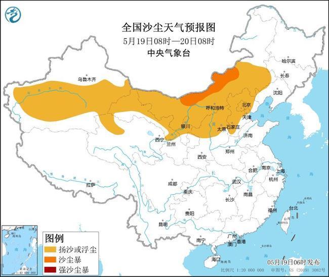 受冷空气大风影响,预计5月19日08时至20日08时,新疆南部和东部、青海西北部、内蒙古中西部和东南部、甘肃西部、宁夏中北部、陕西北部、山西中北部、河北中北部、北京、天津等地的部分地区有扬沙或浮尘天气,其中,内蒙古中西部偏北地区局部有沙尘暴。