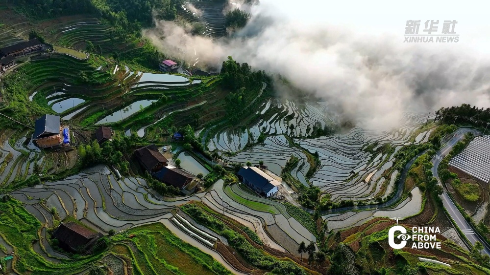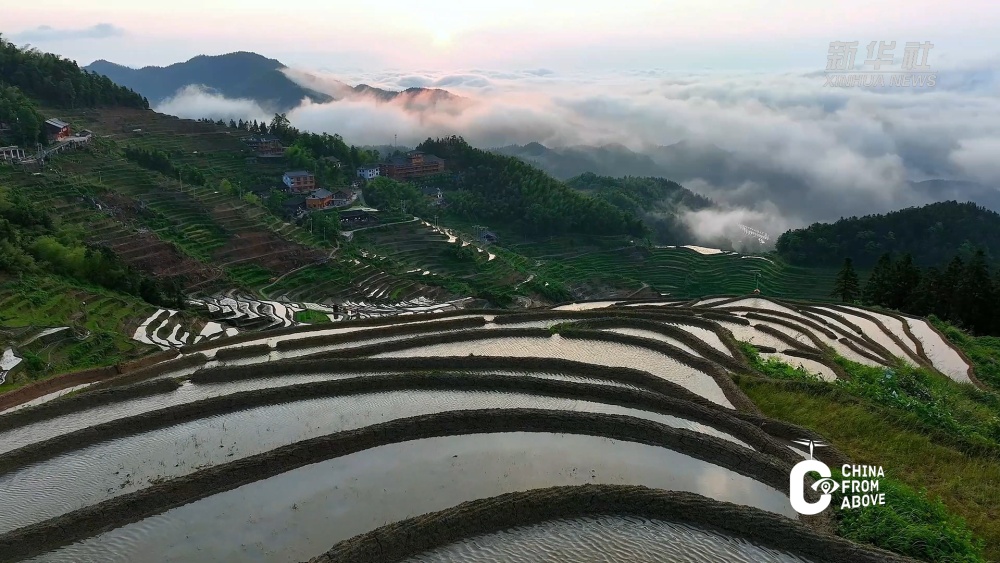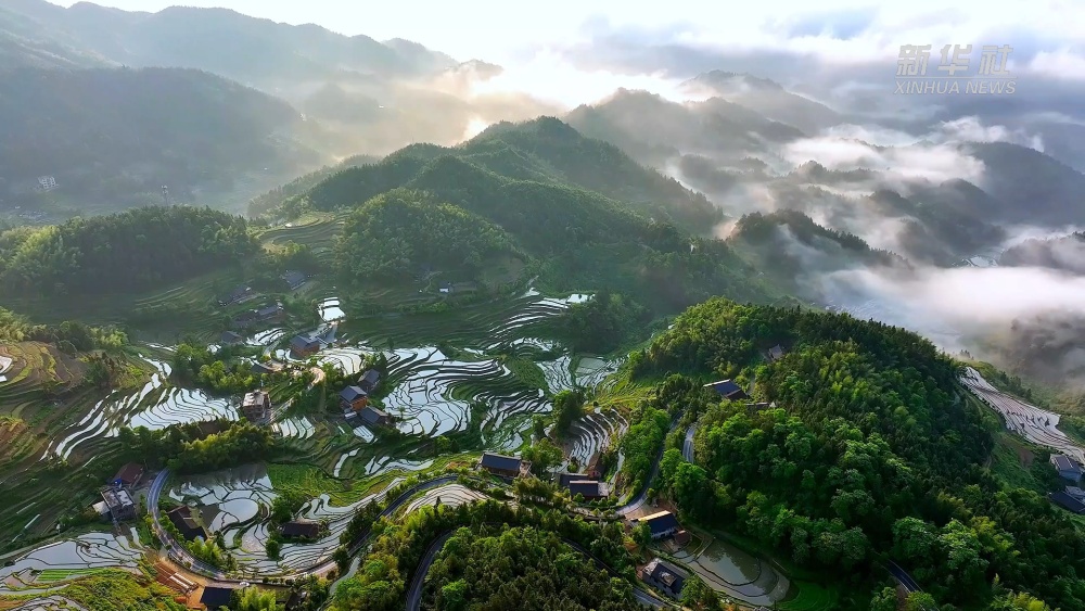 初夏时节,湖南省新化县,依山就势而造的层层梯田水满田畴,与错落有致的古朴村落相映成趣,构成一幅美丽的画卷。