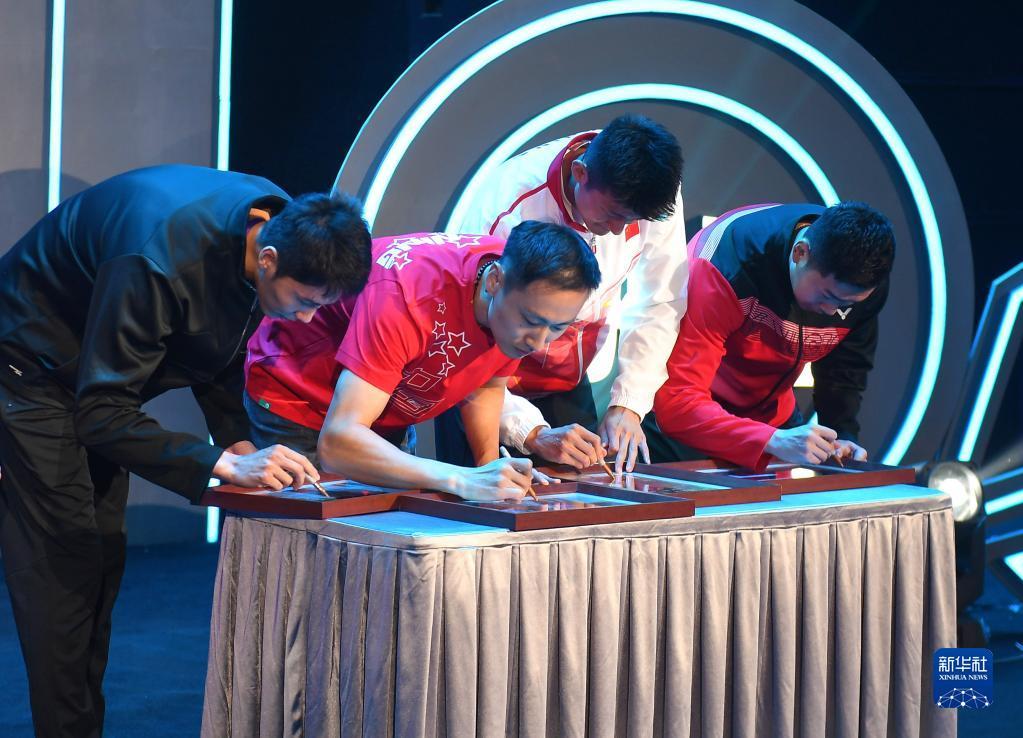 5月19日,退役运动员李俊慧、张楠、谌龙、刘成(从左至右)在退役仪式上签名留念。新华社记者 侯昭康 摄