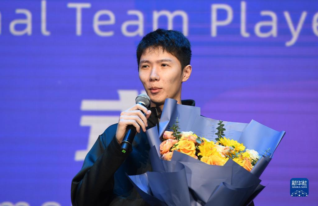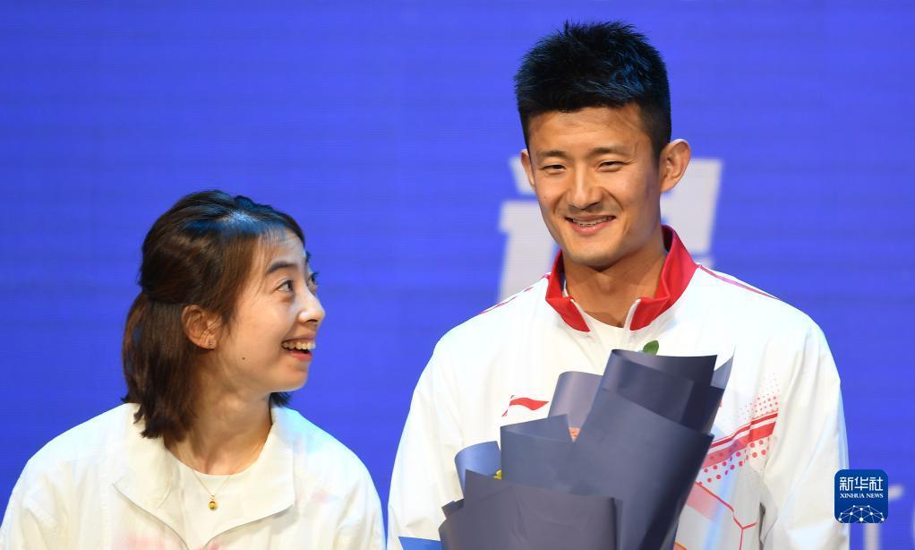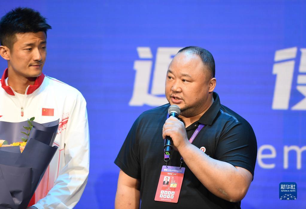 5月19日,中国羽毛球协会主席张军(右)在运动员退役仪式上发言。新华社记者 侯昭康 摄