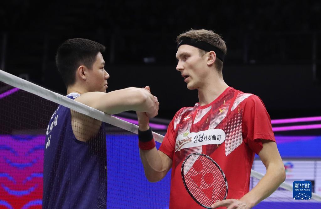 5月19日,丹麦队选手安赛龙(右)在男单比赛中因伤退赛后与马来西亚队选手李梓嘉相互致意。新华社记者 贾浩成 摄