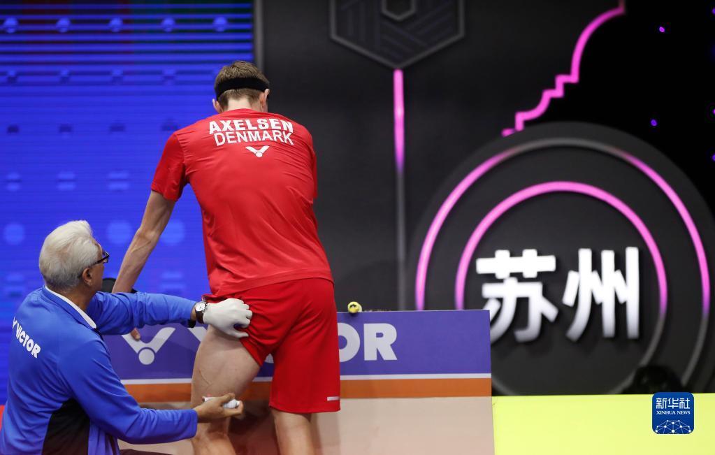 5月19日,丹麦队选手安赛龙在与马来西亚队选手李梓嘉的男单比赛中接受治疗。新华社记者 贾浩成 摄