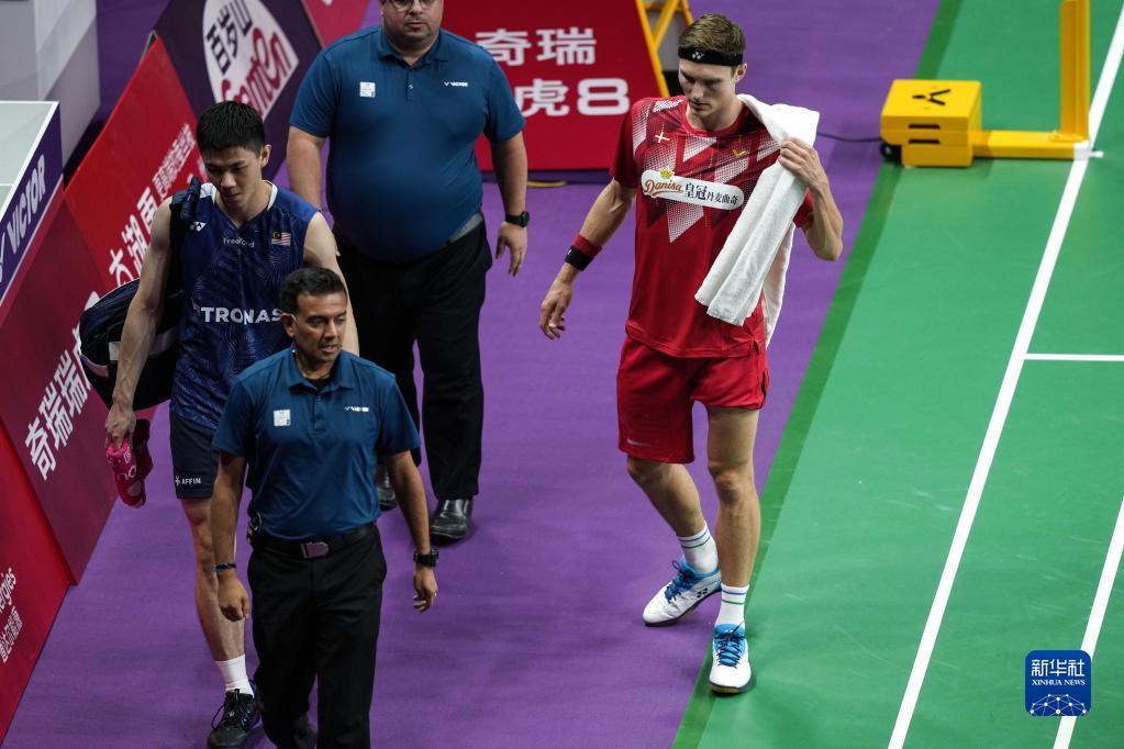 5月19日,丹麦队选手安赛龙(右二)在与马来西亚队选手李梓嘉的男单比赛中因伤退赛。新华社记者 柳文惠 摄