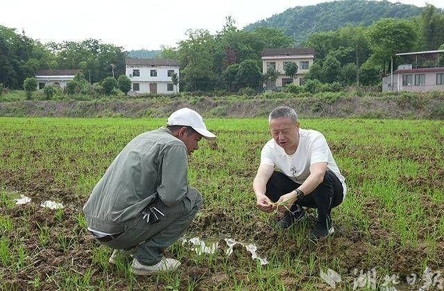 5月18日,赤壁市农业农村局农技专家来到赵李桥镇蓼坪村水稻旱播技术示范点,与种粮大户一起蹲在田间地头,查看稻苗长势。