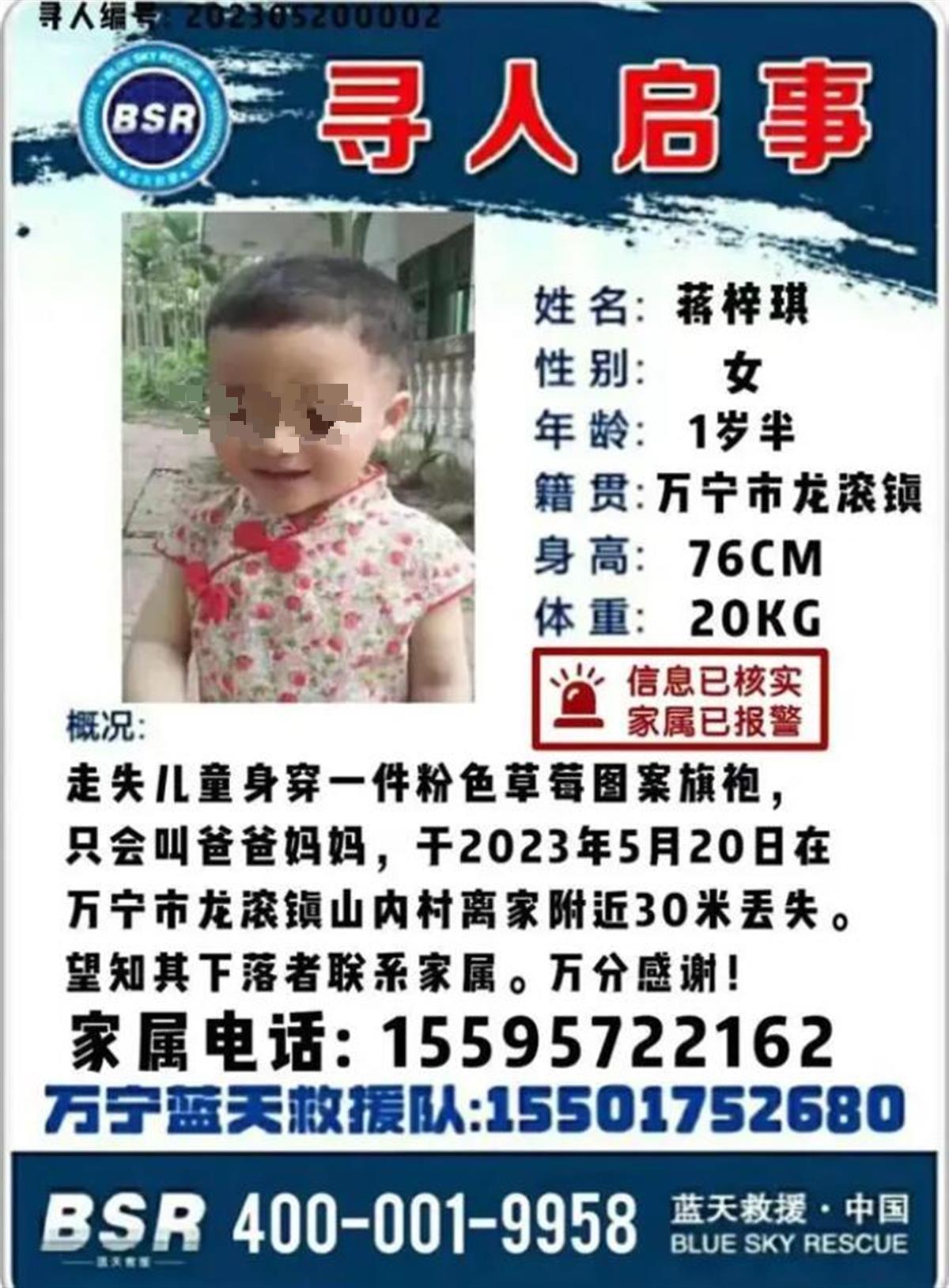 寻人启事显示,失踪女童名叫蒋梓琪,年龄为1岁半,身高76厘米,体重20公斤。5月20日,蒋梓琪在海南万宁龙滚镇山内村走失,走失前身穿粉色草莓图案旗袍。