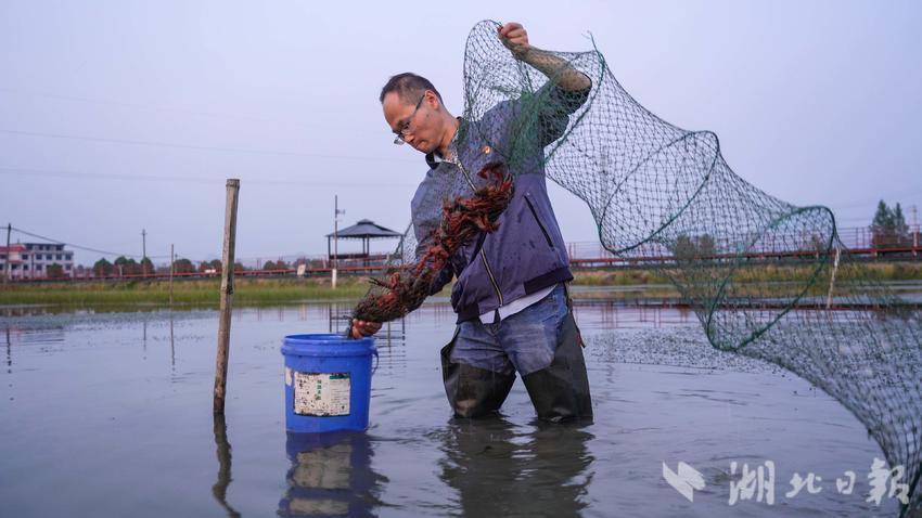 5月21日下午,记者在崇阳县白霓镇金星现代农业产业园莲虾产业化科研示范基地看到,一位个子不高、皮肤晒得黝黑的年轻人,正拎着水桶在虾塘中央收网。随着地笼网的拉起,一只只鲜活体肥的龙虾跃出水面被装进桶中。