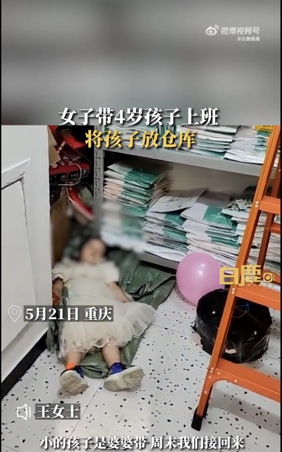 据白鹿视频5月22日报道,5月21日,重庆,女子带4岁女儿上班,将孩子放仓库引关注。