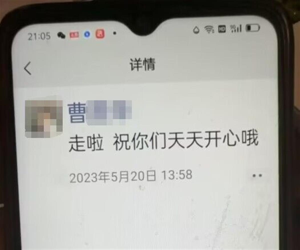 李女士说,曹萍轻生的时间大约在5月20日下午2时许,轻生前她发布的最后一条朋友圈:“走啦,祝你们天天开心哦。”曹萍身亡后,家属还发现了她的遗书,上面写道:“好啦,我走了……别找我了,把我忘了吧!”