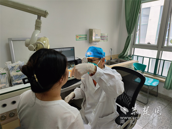 耳鼻喉科主任陈伟在门诊为鼻炎患者进行检查。通讯员供图
