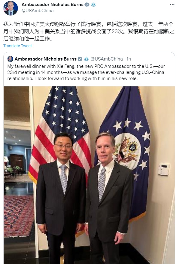 美国驻华大使伯恩斯5月24日在推特发文表示:“为新任中国驻美大使谢锋举行了饯行晚宴。包括这次晚宴,过去一年两个月中我们两人为中美关系当中的诸多挑战会面了23次。我很期待在他履新之后继续和他一起工作。”