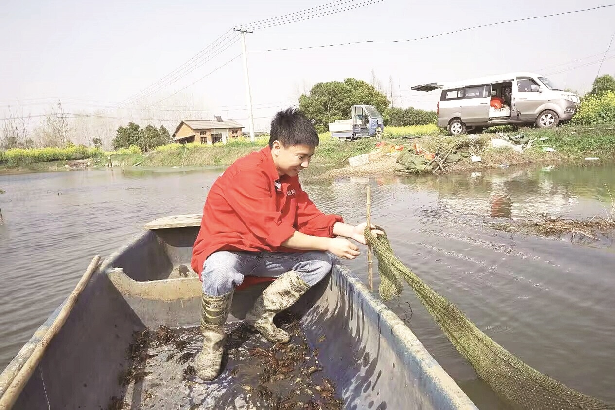 徐飞翼正在自己的虾田中捕虾 受访者供图
