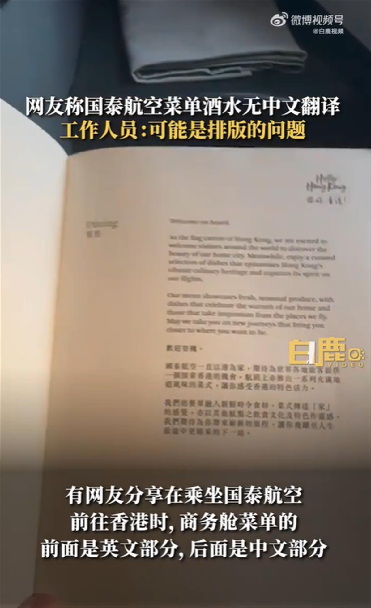 据“白鹿视频”微博公号报道,5月24日,有网友爆料称,在乘坐国泰航空由马来西亚槟城前往香港时,发现飞机上菜单英文比中文还多,而且酒水菜单只有英文,国泰航空回应称:“可能是排版问题。”
