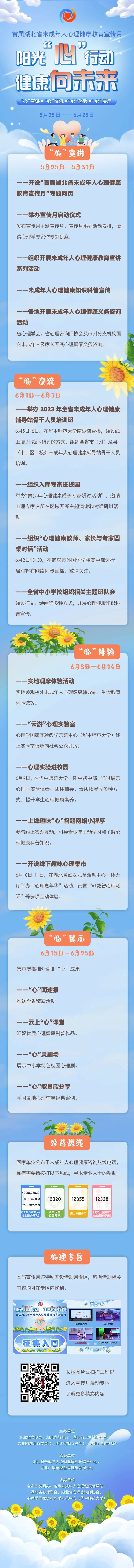 从5月25日至6月25日,湖北省文明办、湖北省教育厅、湖北省卫生健康委员会、共青团湖北省委员会、湖北省妇女联合会、湖北广播电视台联合组织开展为期一个月的首届湖北省未成年人心理健康教育宣传月活动。
