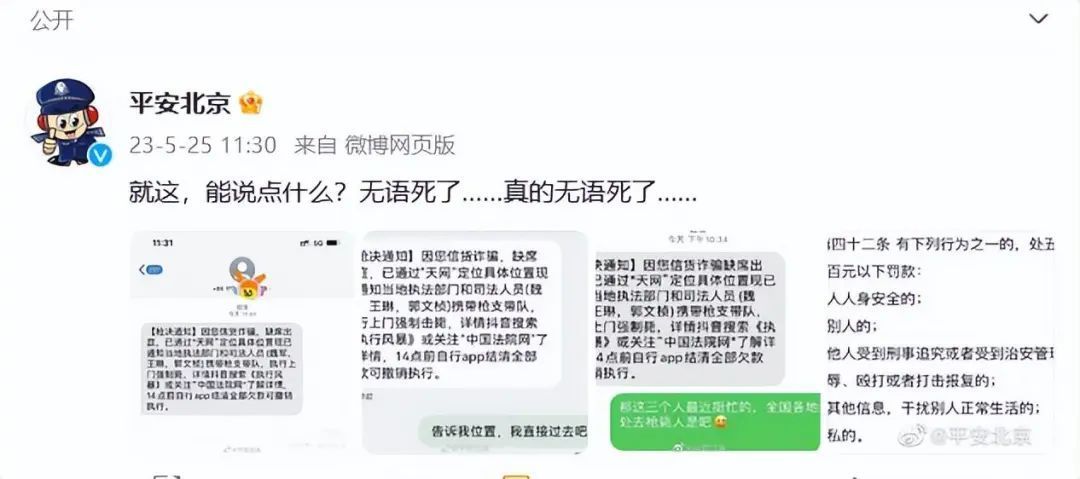 “ 因您信货诈骗,缺席出庭,已通过“天网”定位具体位置现已通知当地执法部门和司法人员(魏军,王琳,郭文祯)携带枪支带队,执行上门强制枪毙,详情抖音搜索《执行风暴》或关注“中国法院网’”了解详情,14点前自行app结清全部欠款可撤销执行。”