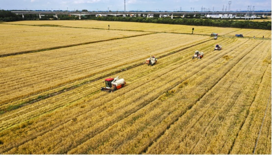 初夏的空气,鲜亮而炽热。四台联合收割机正开足马力,在麦田中穿梭忙碌,一垄垄成熟的小麦被卷进机器,收割、脱粒、除杂一气呵成。“今年雨水好,麦穗饱满,预计亩产可以达到800斤,趁着这两天的晴好天气,2000亩小麦要全部割完。”张家刚说,农忙无闲工,收割后的小麦需运送到合作社烘干车间,他要驾驶铲车转运装袋,很多工序他得直接参与,亲力亲为。