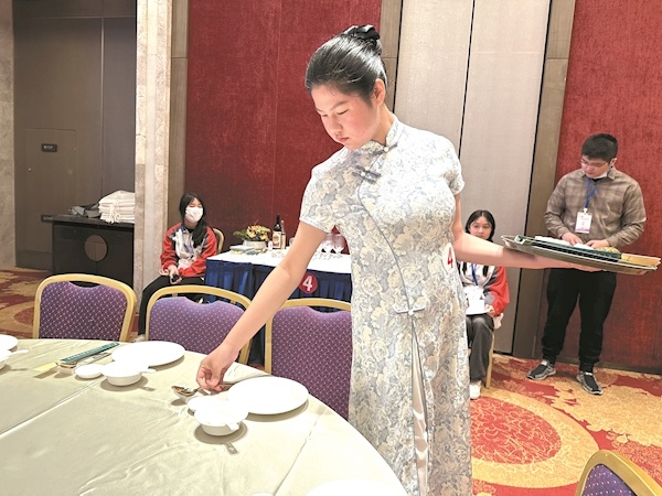 王芳介绍,酒店服务赛项为个人赛,包括中餐宴会摆台、西餐宴会摆台、客房中式铺床、英语水平测试、专业理论测试等5个内容,每名选手需独立完成所报内容,按照酒店综合赛项分值比例算出相应成绩。