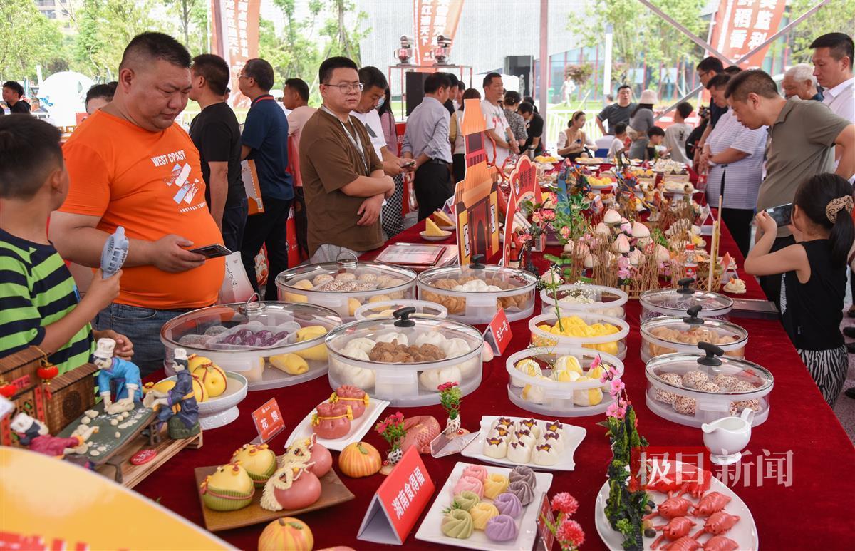 而在紧邻“千人龙虾宴”的万包宴现场,柑橘造型包子、香菇造型包子、卡通人物造型包子、福寿贺喜包子……现场造型各异,精美绝伦的面点吸引游客打卡拍照,现场还排起了长队,他们可免费品尝这个造型新奇的面点。