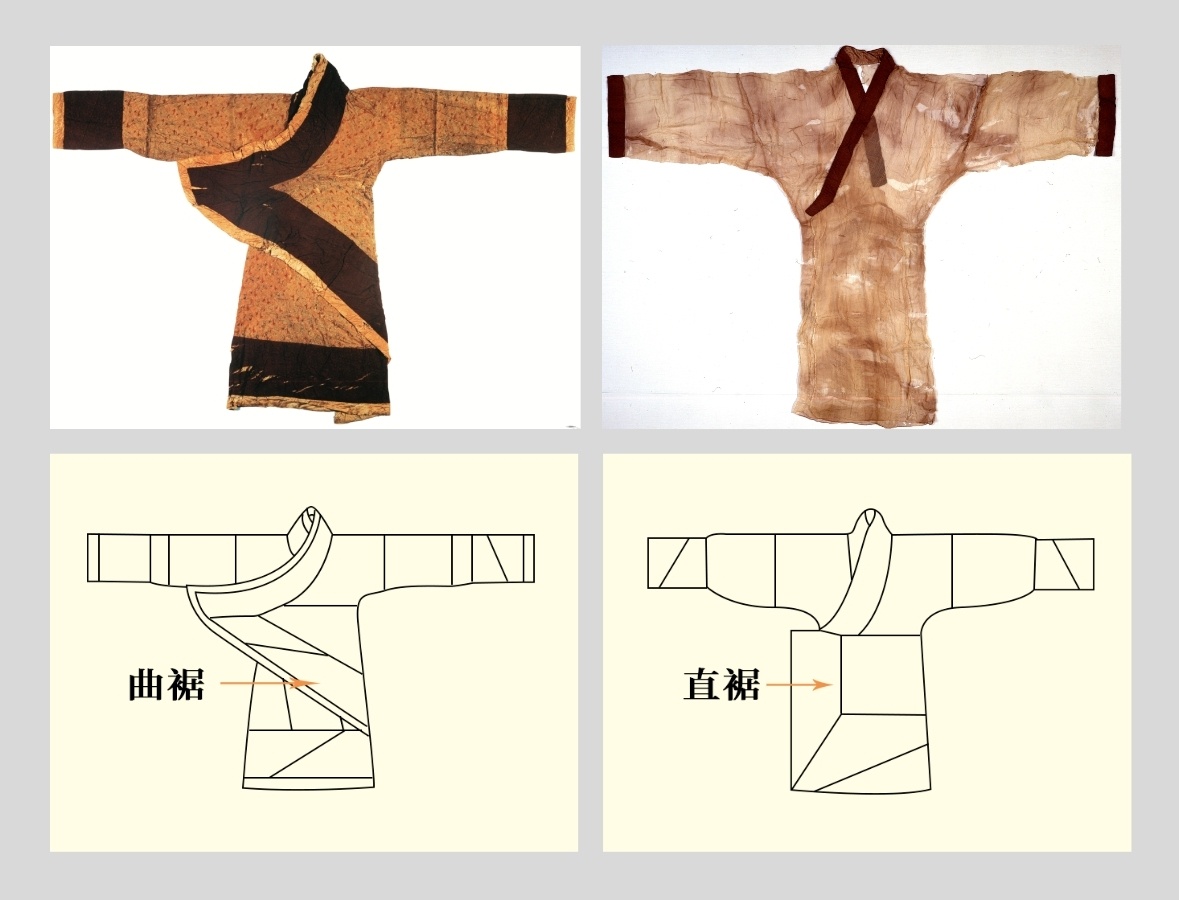 △马王堆一号汉墓出土的罗地“信期绣”丝绵袍(曲裾)、素纱单衣(直裾)
