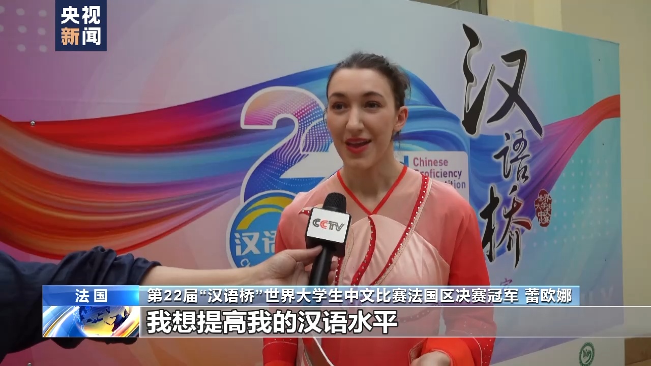 第22届“汉语桥”世界大学生中文比赛法国区决赛冠军 蕾欧娜:我很开心获得第一名,冠军。我想提高我的汉语水平,我的说话、写作、语法水平。
