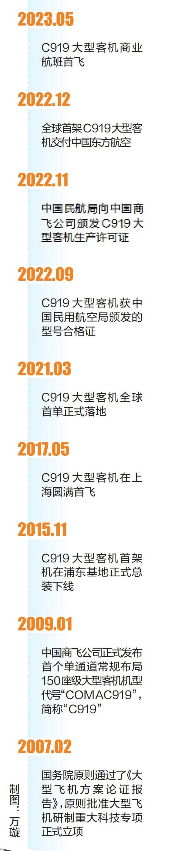 C919大型客机是我国首次按照国际通行适航标准自行研制、具有自主知识产权的喷气式干线客机,于2007年立项,2017年首飞,2022年9月完成全部适航审定工作后获中国民用航空局颁发的型号合格证。