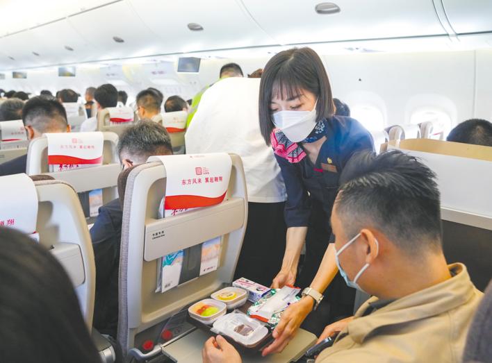 5月28日,乘务员在C919首个商业航班东航MU9191飞行途中为旅客提供餐食。