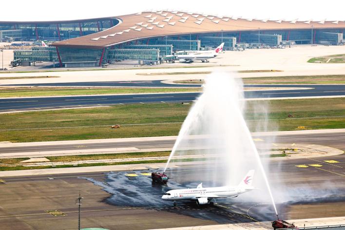 5月28日,北京首都国际机场以水门礼迎接C919首个商业航班东航MU9191。