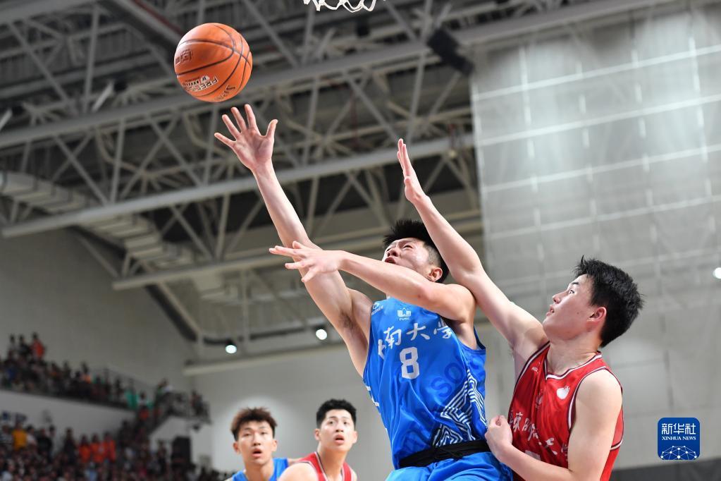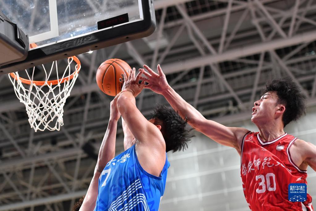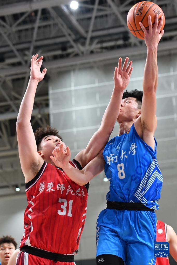 5月27日,华东师范大学队球员林天驹(右)封盖中南大学队球员高廷贤的投篮。新华社记者 陈振海 摄